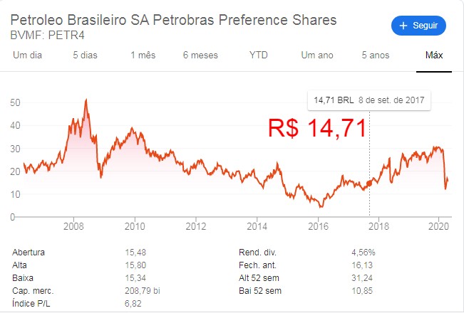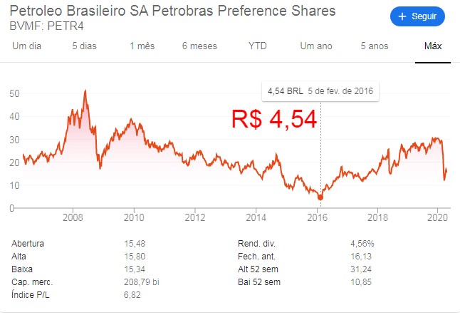 Conosco aconteceu por volta de 2016, quando as ações da Petrobrás estavam custando menos que R$ 10,00 por cota, e se tivessemos investido pouco dinheiro, teríamos dobrado nosso aporte em questão de 1 ano e meio.